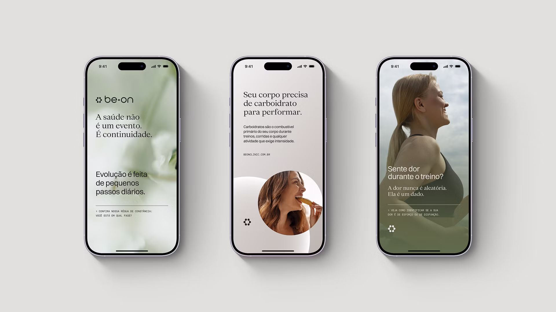 Partimos de um território central: “saúde inteligente”, ancorando-se na narrativa: "Live better, by choice". A estratégia posiciona a be·on como um ecossistema integrado que conecta medicina, nutrição, treino e comportamento em uma jornada contínua de evolução. A marca passa a liderar um novo modelo: saúde como processo, performance como consequência, ciência como meio.